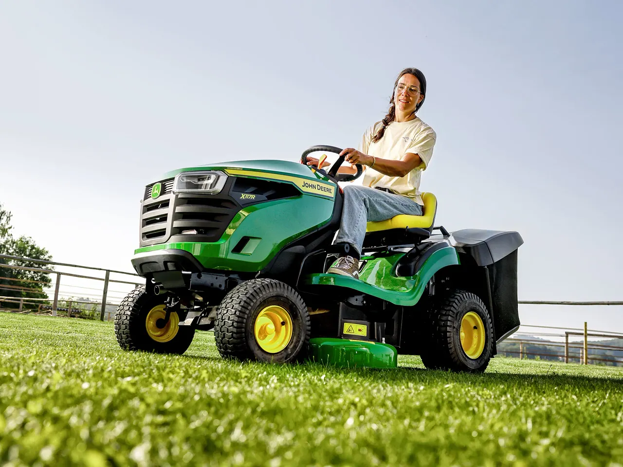 Der John Deere X117R wird mit Mähwerk und 300 l Grasfangkorb geliefert.